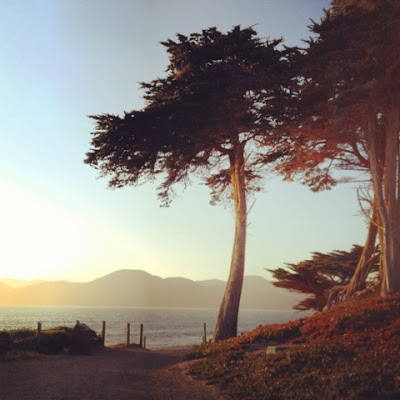 a really crappy iphone photo of golden gate bridge with memorial cemetery in the foreground